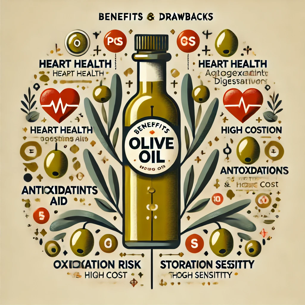 | 소화기 건강 증진 – 장 건강을 돕고 변비 예방 효과 | 가격이 비쌈 – 고품질 엑스트라 버진 올리브오일은 비교적 고가 |